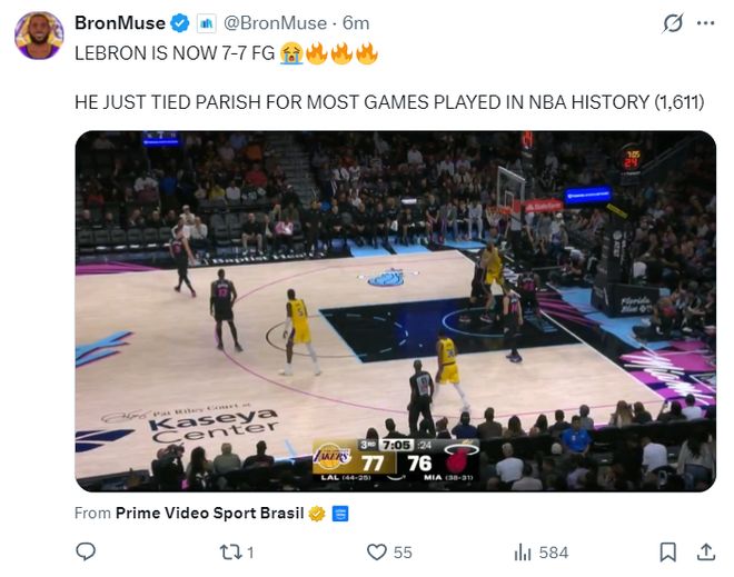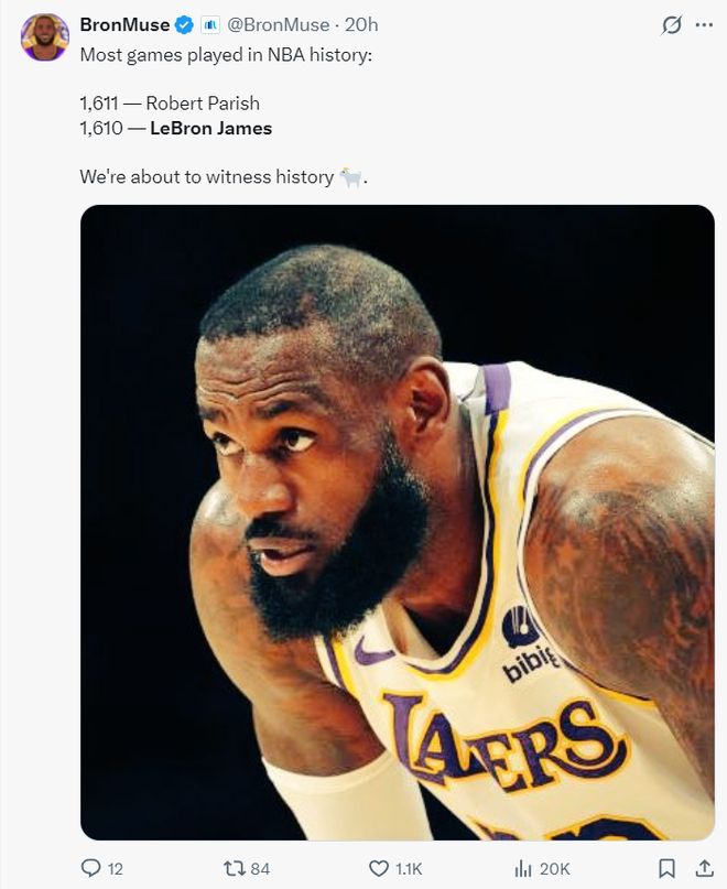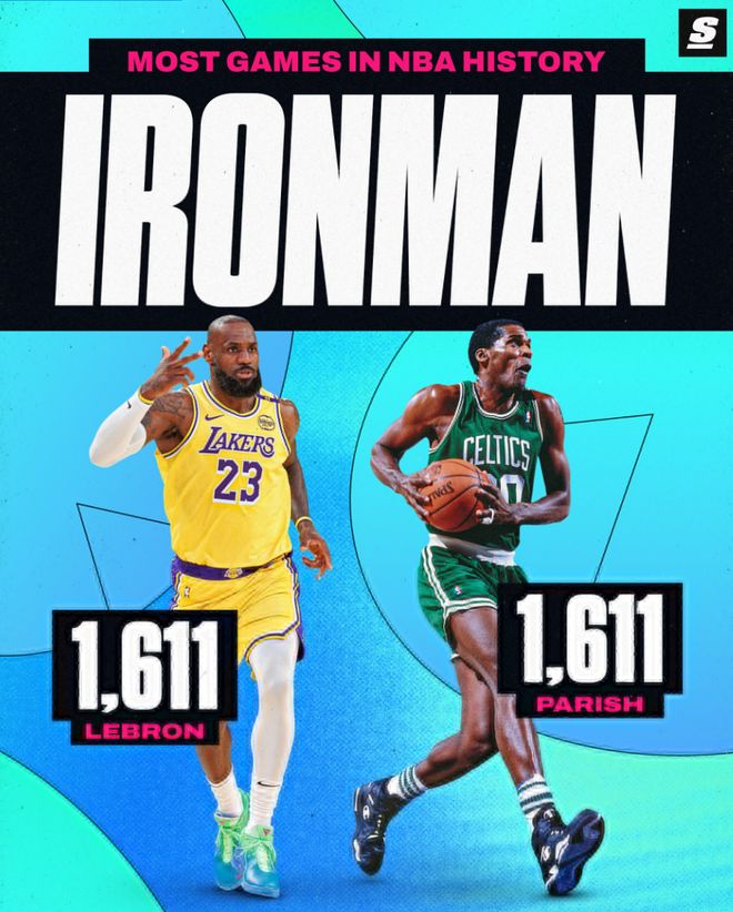 昨夜勒布朗在面對火箭的比賽中14中13+三分2中2拿到30分一戰(zhàn)刷新多項紀(jì)錄,41歲的老將此役決定出戰(zhàn)背靠背后他生涯登場數(shù)1611場追平了帕特里什并列歷史第一,這位歷史最長的河繼續(xù)創(chuàng)造歷史。