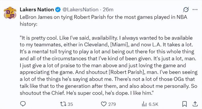 詹姆斯談追平帕里什1611出場次數的紀錄:很棒,就像我此前說的我一直都想為隊友提供幫助,不管是在克村、邁阿密、洛杉磯都一樣,這需要付出很大的努力與 巨大的精神力,你需要不停的參加比賽應付一切突發(fā)情況。我真的很熱愛這項運動也很感激這項運動,我想跟帕里什擊個掌。