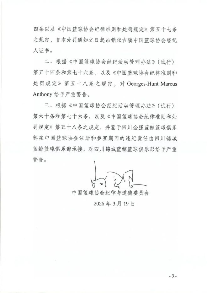 今天四川也吸引了一些目光,但并非什么正面原因。中國籃球協(xié)會紀(jì)律與道德委員會發(fā)布處罰決定:因合同造假、手續(xù)缺失而嚴(yán)重違規(guī),吊銷了張吉驥的經(jīng)紀(jì)人證書;因未依規(guī)辦理手續(xù),對馬庫斯·亨特給予嚴(yán)重警告;因未盡注意義務(wù)和手續(xù)缺失,對四川錦城藍(lán)鯨俱樂部給予嚴(yán)重警告。
