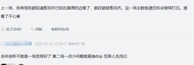 還有球迷舉出了徐昕的例子:去年徐昕不就是一場發(fā)揮好了,第二場一點(diǎn)小問題就直接dnp,互換人生而已。