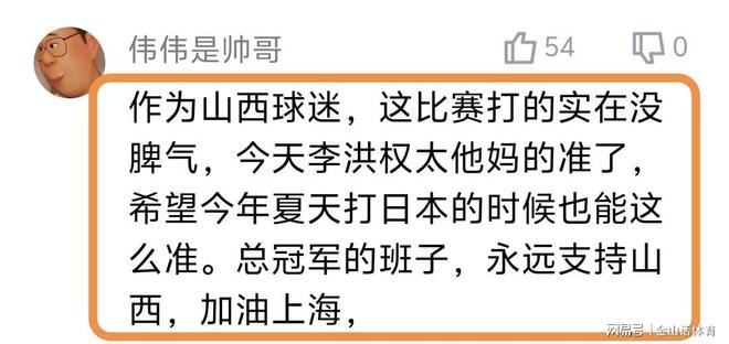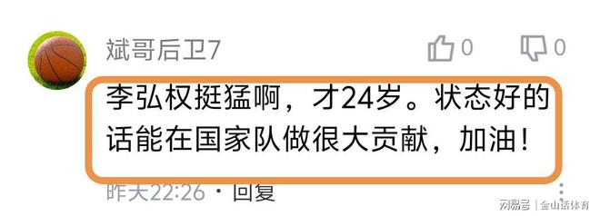 李弘權(quán)出色的表現(xiàn),也讓球迷們是喜出望外,賽后紛紛在網(wǎng)絡(luò)平臺(tái)留言。“作為山西球迷,這比賽打的實(shí)在沒(méi)脾氣,今天李洪權(quán)太準(zhǔn)了,希望今年夏天打日本的時(shí)候也能這么準(zhǔn)??偣谲姷陌嘧?,永遠(yuǎn)支持山西,加油上海,”;“李弘權(quán)挺猛啊,才24歲。狀態(tài)好的話能在國(guó)家隊(duì)做很大貢獻(xiàn),加油!”;“真心話,就這國(guó)家隊(duì)以前都不帶李弘權(quán)。希望今年世預(yù)賽也能進(jìn)入國(guó)家隊(duì),也能這么準(zhǔn),好好收拾小本子?!薄?/p>