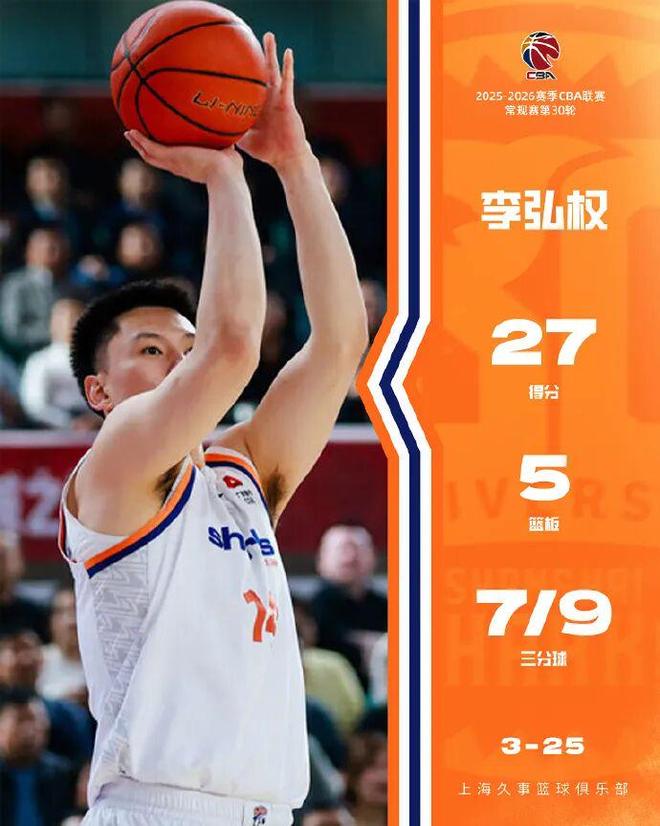 李弘權(quán)毫無疑問是此役最靚的仔,首發(fā)出戰(zhàn)不到20分鐘,就投籃11中8,其中三分球9中7貢獻(xiàn)27分外加5板,正負(fù)值+25冠絕全場,把對手錘到生活不能自理。