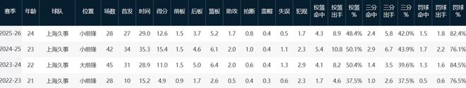 這哥們出生于2001年9月29日,身高1米98&體重102公斤的重型前鋒,三至四號位搖擺人,本賽季至今出戰(zhàn)27場首發(fā)26次,場均上陣29分鐘得到12.6分5.2板1.7助,投籃命中率48.4%,場均以42%命中率扔進(jìn)2.4記三分球。