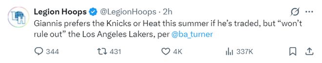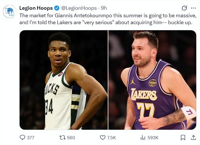 根據(jù)NBA記者的說法,揚(yáng)尼斯今夏傾向于加盟尼克斯,但不排除選擇洛杉磯湖人隊。