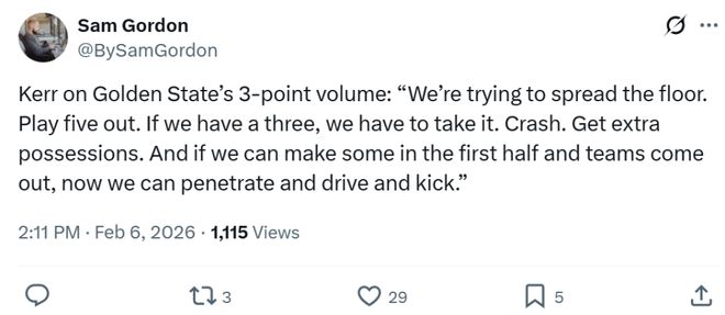 而勇士隊之所以能夠拿下勝利,主帥科爾的變陣與用人成為關(guān)鍵,半場瘋狂出手37記三分創(chuàng)造NBA歷史紀錄,半場在籃下0-3英尺僅出手5次,只造成了一次投籃犯規(guī),可謂是將對于三分投射的依賴發(fā)揮到了極致。