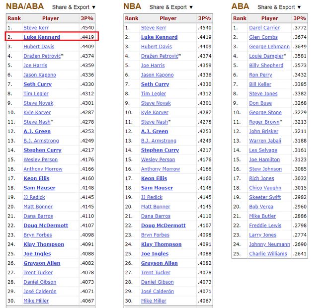 肯納德是一位歷史級別的超級射手。在本賽季的三分命中率榜上,肯納德以49.7%排名聯(lián)盟第一,火箭隊的伊森以48.8%排名第二,騎士隊的杰隆·泰森以48.1排名第三。