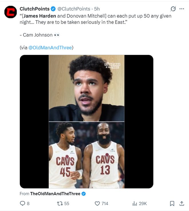 掘金球員卡梅倫-約翰斯在直播時(shí)談到哈登+米切爾的組合,他表示:騎士隊(duì)會(huì)變得非常強(qiáng)大,因?yàn)楣恰⒚浊袪杻扇硕际强梢砸粓?chǎng)50+的球員,米登組合會(huì)非常之恐怖。