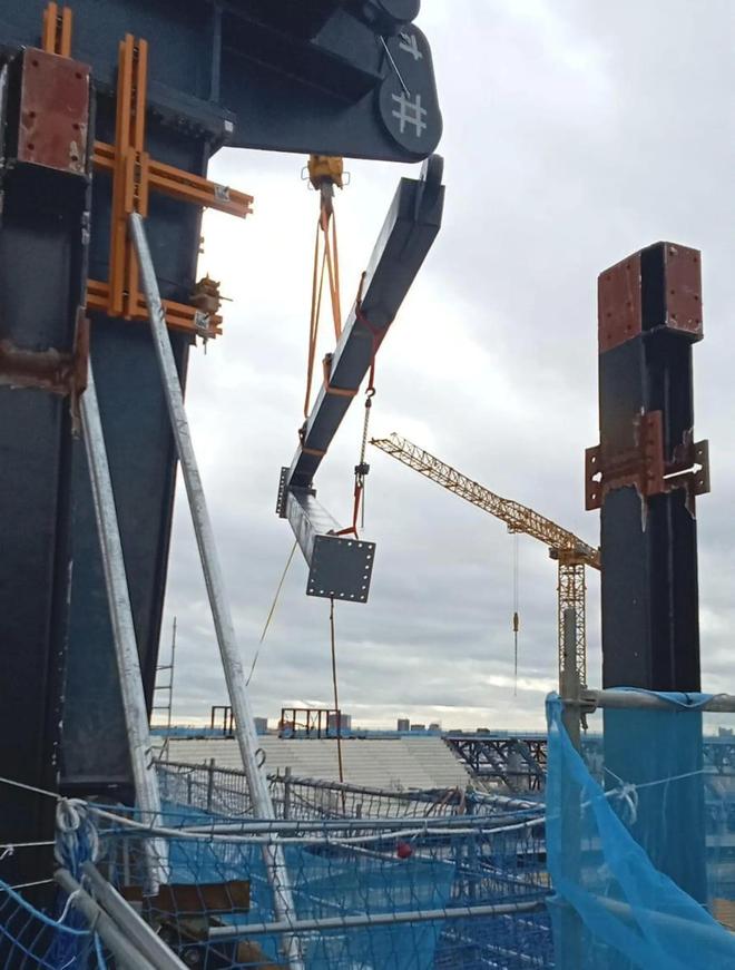 正如《Culemanía》此前披露,德國(guó)公司Montage Service將負(fù)責(zé)頂棚鋼纜的安裝和張拉、特殊膜結(jié)構(gòu)屋頂?shù)匿佋O(shè)、太陽能板安裝以及照明系統(tǒng)的組裝。雖然距離頂棚安裝仍有大約一年時(shí)間,但利馬克公司已經(jīng)在為后續(xù)工程做準(zhǔn)備。工人正在安裝共46根支撐立柱,這些立柱將支撐球場(chǎng)頂棚的主體結(jié)構(gòu)。每根梁重約28噸,高約五米,通過大型起重機(jī)吊裝至第十層結(jié)構(gòu)位置,這一層將構(gòu)成未來球場(chǎng)頂棚。