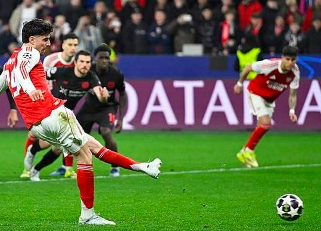 第89分鐘,馬杜埃凱突入禁區(qū)后倒地,裁判判罰點球。哈弗茨面對舊主,扳平比分。