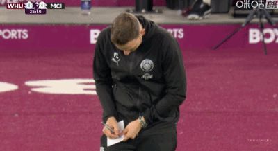 第27分鐘,表情有些糾結,瓜帥助理教練林德斯場邊記錄