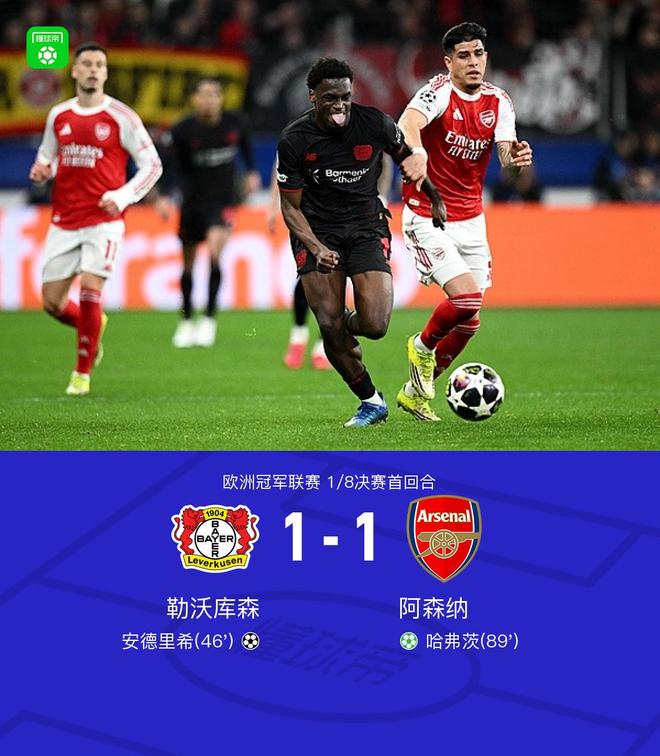 北京時(shí)間3月12日歐洲冠軍聯(lián)賽 1/8決賽首回合,勒沃庫(kù)森對(duì)陣阿森納。下半場(chǎng)剛開場(chǎng)格里馬爾多開出角球,安德里希頭球破門,比賽尾聲馬杜埃凱造點(diǎn),哈弗茨面對(duì)舊主將球罰進(jìn),最終阿森納1-1戰(zhàn)平勒沃庫(kù)森。