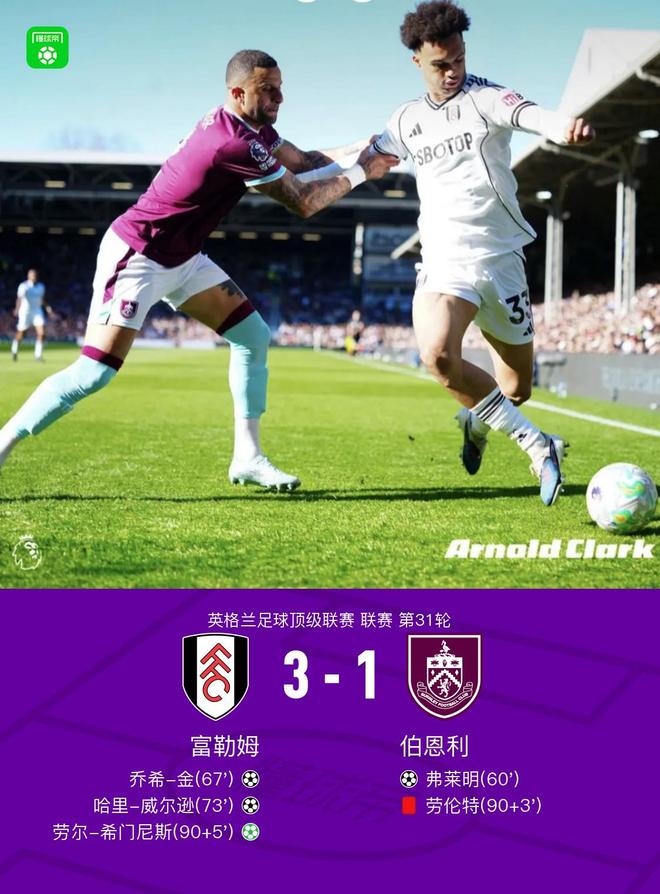 - 富勒姆3-1伯恩利,希門尼斯點(diǎn)射,勞倫特染紅