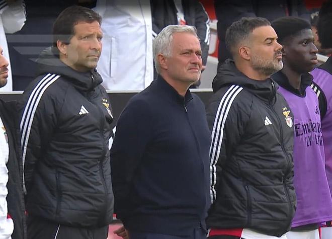 3月22日,在葡超第27輪本菲卡對(duì)陣吉馬良斯賽前,本菲卡主場(chǎng)為前穆里尼奧團(tuán)隊(duì)的門將教練希爾維諾舉行了默哀儀式,穆里尼奧潸然淚下。