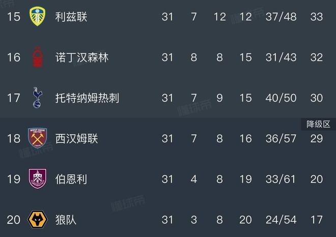 英超降級區(qū)積分榜情況