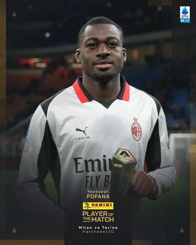 意甲第30輪,米蘭3-2戰(zhàn)勝都靈。賽后意甲官方宣布,米蘭中場福法納當選全場最佳球員。