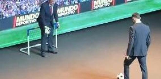 霍安-加西亞從英格列斯百貨加泰羅尼亞區(qū)公關(guān)總監(jiān)伊娃-弗蘭克斯手中接過(guò)了獎(jiǎng)杯,隨后還上演了一幕別開生面的趣味環(huán)節(jié)。頒獎(jiǎng)典禮的舞臺(tái)上出現(xiàn)了一座標(biāo)準(zhǔn)尺寸的虛擬球門,在主持人霍爾迪-巴斯蒂的提議下,這座球門被立刻換成了迷你尺寸,他還向霍安-加西亞發(fā)起挑戰(zhàn),讓這位門將站上點(diǎn)球點(diǎn)主罰,而自己則臨時(shí)客串門將。