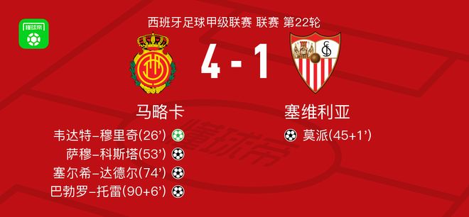 北京時(shí)間2月3日西班牙足球甲級(jí)聯(lián)賽 聯(lián)賽 第22輪,馬略卡主場(chǎng)對(duì)陣塞維利亞。馬略卡韋達(dá)特-穆里奇破門,薩穆-科斯塔破門,塞爾希-達(dá)德爾破門,巴勃羅-托雷破門。塞維利亞莫派破門。最終比分馬略卡 4-1 塞維利亞。