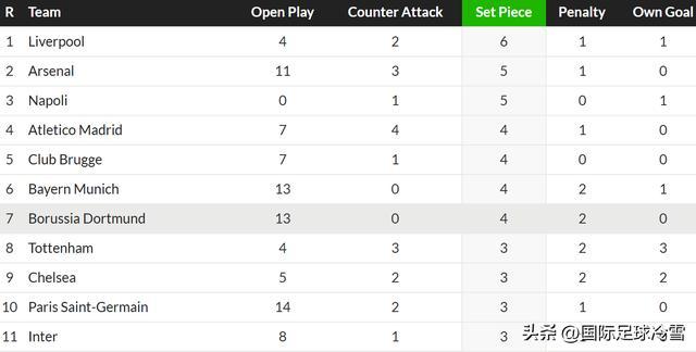 不止看聯(lián)賽,也看歐冠表現(xiàn)的話,多特蒙德前7輪通過角球、定位球攻入4球,是歐冠并列第四多,比通過定位球打入3球的國米更多。