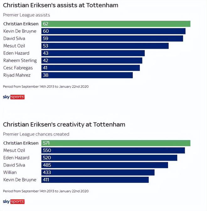 在熱刺的巔峰時期,埃里克森不僅做到了這些,還展現(xiàn)了更多——他堪稱英超聯(lián)賽中最出色的創(chuàng)造力源泉。這樣的說法看似大膽,但數(shù)據(jù)足以佐證:在熱刺效力期間,這位丹麥中場的助攻數(shù)和創(chuàng)造機會數(shù)均位居聯(lián)賽第一,同期禁區(qū)外進球數(shù)也超過了其他任何英超球員。