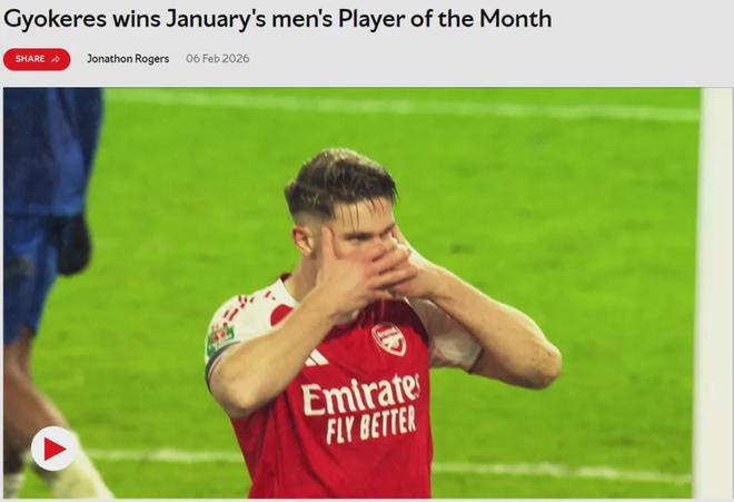 官方:阿森納宣布哲凱賴什當(dāng)選隊(duì)內(nèi)一月份最佳球員。