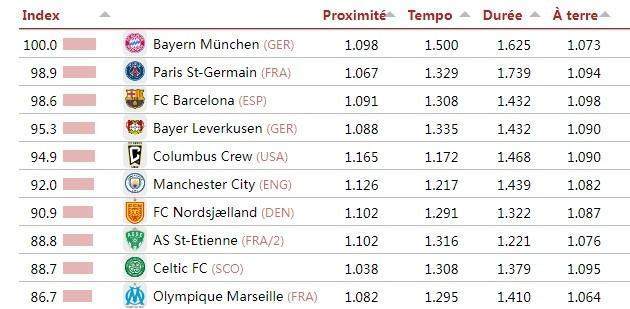 知名數(shù)據(jù)評(píng)測(cè)機(jī)構(gòu)足球天文臺(tái)(CIES)基于合作伙伴Impect的數(shù)據(jù),結(jié)合58個(gè)主流聯(lián)賽公布了全球最具“控球主導(dǎo)、傳控風(fēng)格”的球隊(duì)排名,拜仁以100分的基準(zhǔn)分登頂榜首,巴黎巴薩分列二三位。數(shù)據(jù)核心排名標(biāo)準(zhǔn)通過以下四項(xiàng)技術(shù)指標(biāo)綜合評(píng)定:傳球距離(越短越好)、控球階段的傳球速度、平均單次控球時(shí)長(zhǎng),以及在前場(chǎng)三分之一區(qū)域,膝蓋以下接球的百分比。排名第一的拜仁獲得了100分的綜合評(píng)分(即其他球隊(duì)以拜仁的100分作為綜合指標(biāo)),巴黎、巴薩作為二、三名分獲98.9和98.6分。第4-10名分別為:勒沃庫(kù)森(德甲)、哥倫布機(jī)員(美職聯(lián))、曼城(英超,92分)、北西蘭(丹麥超)、圣埃蒂安(法乙)、凱爾特人(蘇超)、馬賽(法甲)。11-20名分別為:布拉加(葡超)、博德閃耀(挪超)、吉達(dá)聯(lián)合(沙特聯(lián))、皇馬(西甲,84分)、哈馬比(瑞典超)、圣地亞哥(美職聯(lián))、錫爾克堡(丹麥超)、利物浦(英超,81.9分)、洛杉磯FC(美職聯(lián))和埃爾切(西甲)