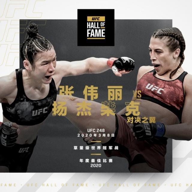 UFC官宣,張偉麗vs喬安娜(UFC 248)入選2026年UFC名人堂“對(duì)決之翼”,成為UFC歷史上首場(chǎng)入選名人堂的女子比賽。這場(chǎng)比賽兩人激戰(zhàn)五回合,共打出351次有效擊打,創(chuàng)下UFC女子賽事單場(chǎng)紀(jì)錄、冠軍戰(zhàn)歷史第三高。最終張偉麗分歧判定獲勝衛(wèi)冕,該戰(zhàn)被公認(rèn)為八角籠最偉大比賽之一。名人堂儀式將于今年夏季舉辦。