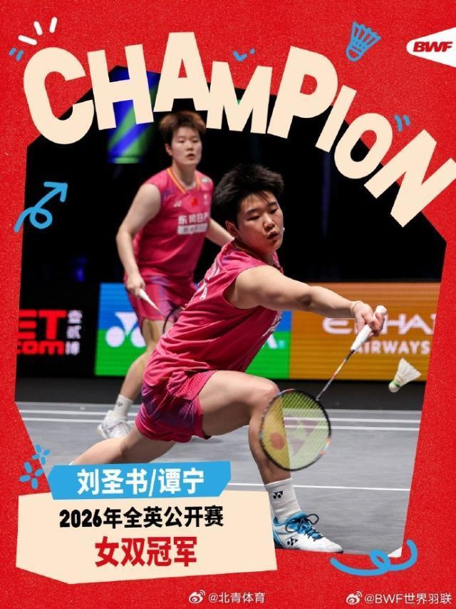 羽毛球全英公開賽女雙決賽,譚寧/劉圣書2比0戰(zhàn)勝李紹希/白荷娜,奪得冠軍。比分:21比18、21比12。