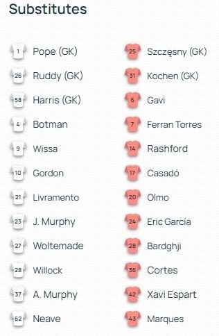 替補(bǔ):6-加維、7-費(fèi)蘭-托雷斯、14-拉什福德、17-卡薩多、20-奧爾莫、24-埃里克-加西亞、25-什琴斯尼、28-巴爾德吉、31-迭戈-科亨、36-科爾特斯、42-埃斯帕特、43-湯米-馬克斯